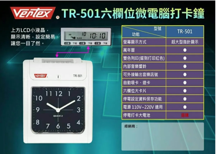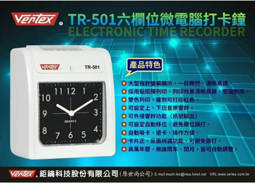 型號:Vertex 世尚六欄位微電腦智慧型打卡鐘 TR-501