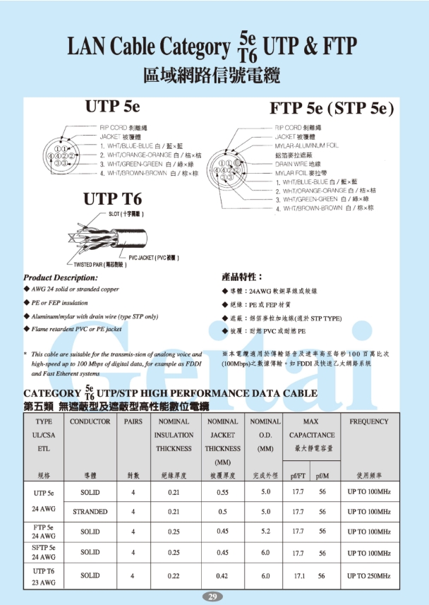紀泰牌 CAT5E-UTP 網路線(黃)-305米 Conductor : 24 AWG stranded copper or solid copper