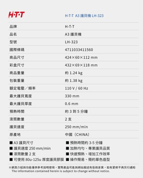 H-T-T A3 護貝機 LH-323全台最低價0910090333